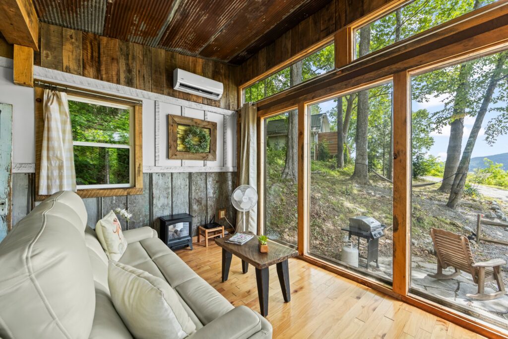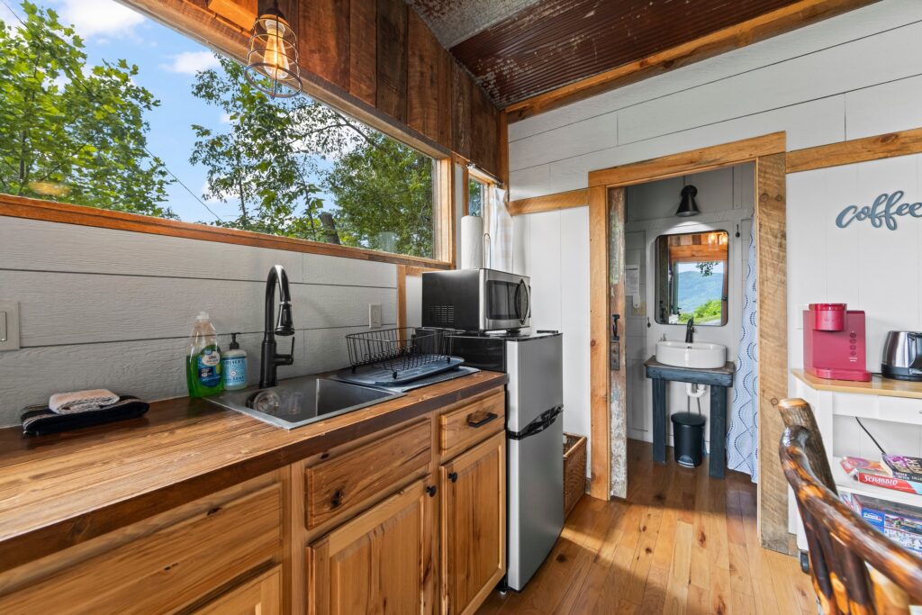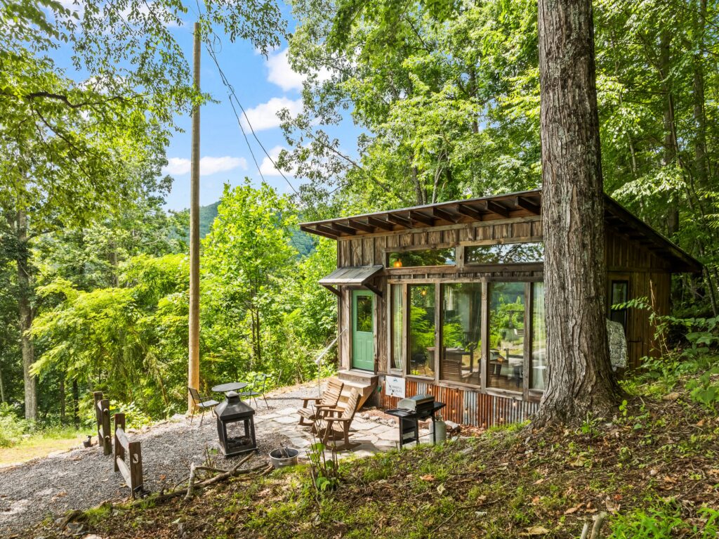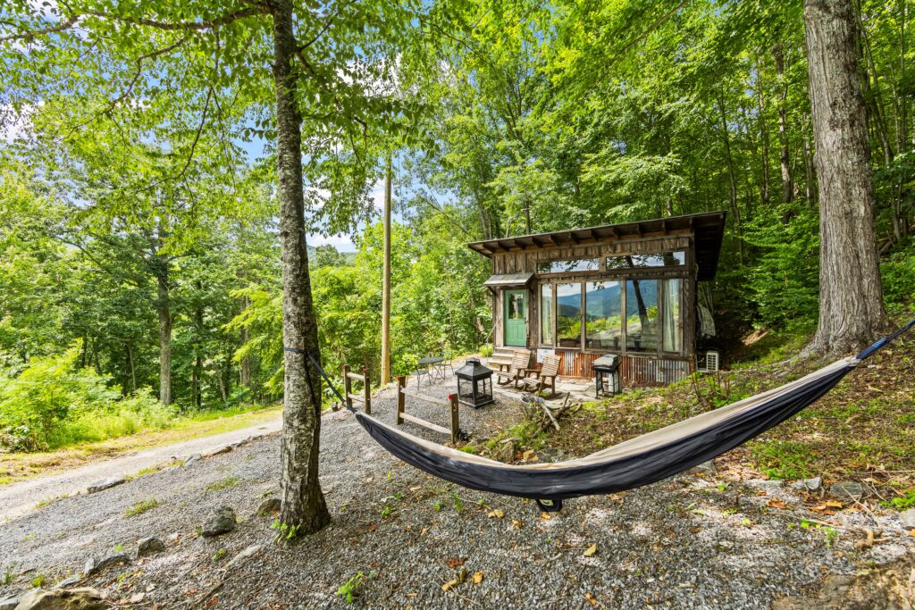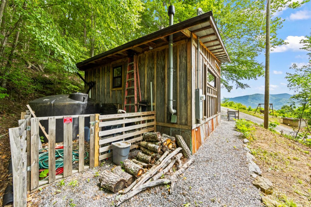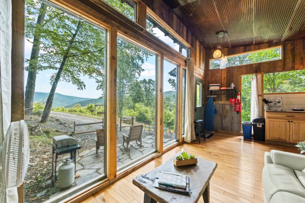 The property features a nicely finished glamping home with an open concept floorplan and one bathroom. Relax on the front porch and take in the awe-inspiring views into the National Forest. The home is connected to electricity and has a functioning kitchen, mini split for HVAC, and is sold fully furnished with quality fixtures, furnishings, and linens. Water is currently supplied by a roof collection system with a 250-gallon storage tank, and water is treated through 3 phases of filters and a UV filtration process.