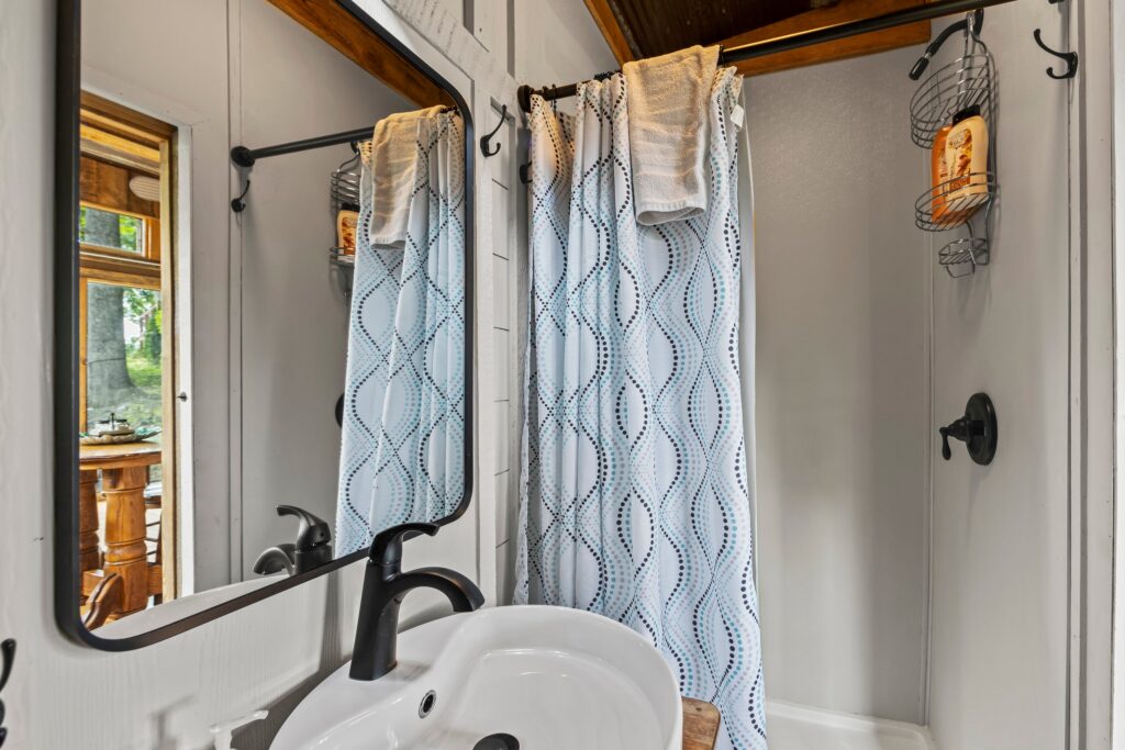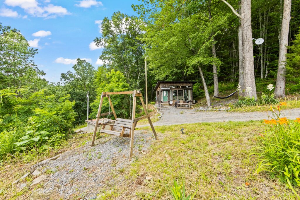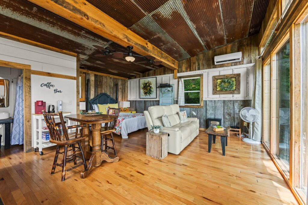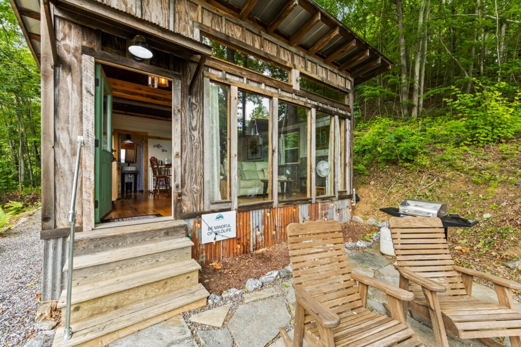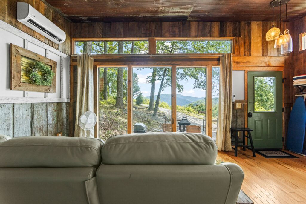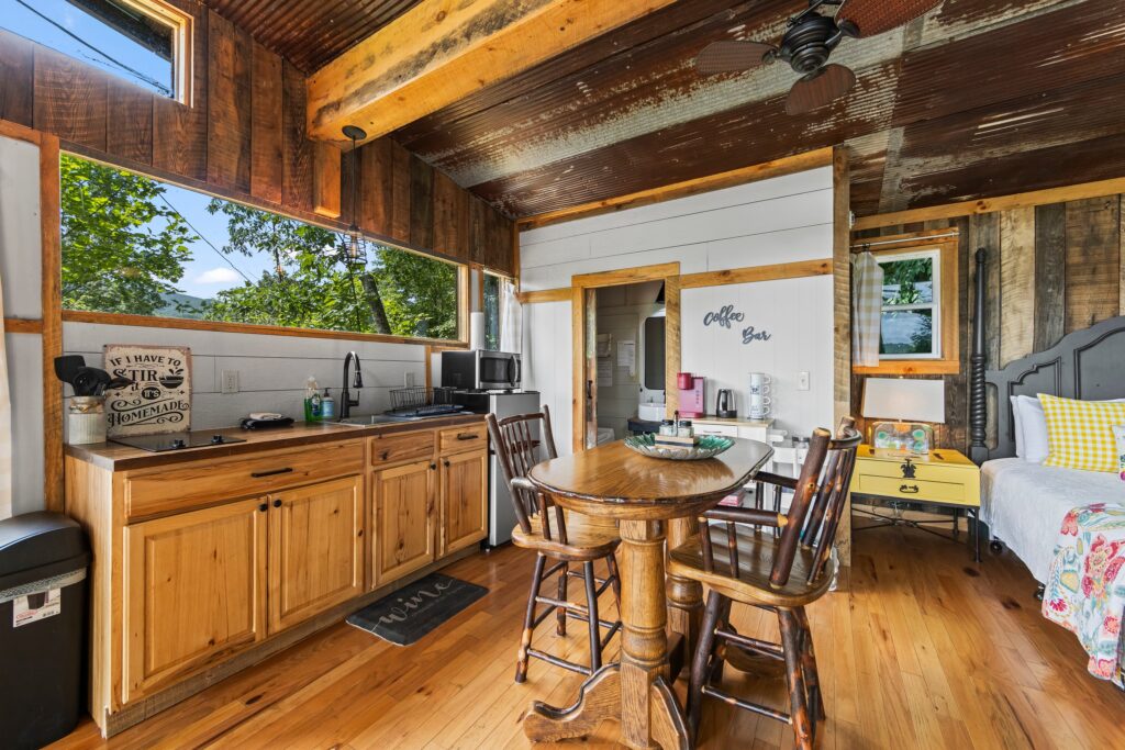 The property features a nicely finished glamping home with an open concept floorplan and one bathroom. Relax on the front porch and take in the awe-inspiring views into the National Forest. The home is connected to electricity and has a functioning kitchen, mini split for HVAC, and is sold fully furnished with quality fixtures, furnishings, and linens. Water is currently supplied by a roof collection system with a 250-gallon storage tank, and water is treated through 3 phases of filters and a UV filtration process.