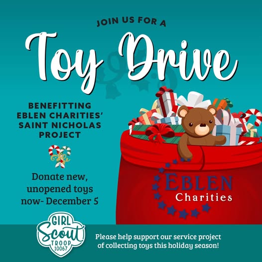 Eblen Charities provides toys, clothing, and essential items for families through their annual Saint Nicholas Project. Girl Scout Troop 10067 is collecting toys on Eblen’s behalf — drop off a new, unwrapped toy at the Keller Williams Asheville office (48 Grove St) anytime through December 5.